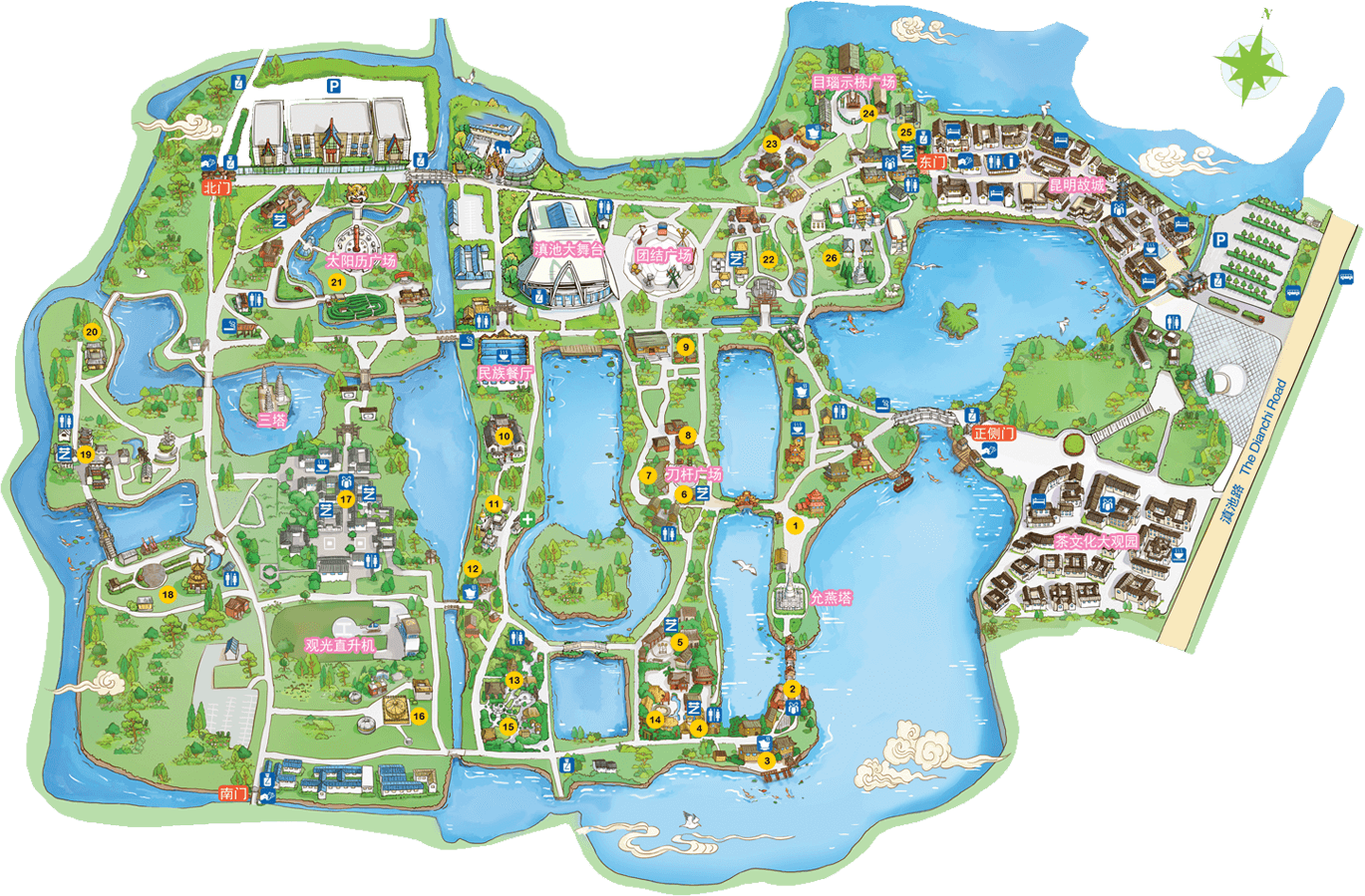 佤族人口約36萬,主要聚居在云南省瀾滄江南段以西的阿佤山區(qū)。佤族寨位于“翠漪洲”東南角。寨內(nèi)分布有茅草頂?shù)母蓹谑浇ㄖ骸⑴n^廣場、神靈廣場、司崗里石雕以及糧倉等。牛頭廣場是佤族古老的剽牛活動場所,場正中的牛角為佤族的寨樁,廣場前的兩個石人分別為佤族的男性和女性祖先。神靈廣場表現(xiàn)了佤族萬物有靈、靈魂不死的自然崇拜觀念。場中兩個石人雕像分別為佤族最崇拜的“木依吉”和“阿依娥”。佤族木鼓舞節(jié)拍鮮明強烈,...